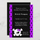 Invitaciones de cumpleaños del cráneo blanco con un cráneo y un gráfico de hueso cruzado. Fondo punteado morado y negro que coincide con el arco morado del cráneo. Personalizar con los detalles de su fiesta.delightfuldoodles
