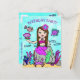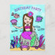 Una forma linda y asequible de invitar a amigos a la fiesta de cumpleaños de una niña. Un estilo de arte popular dibujado a mano caprichoso sirena caucásica de pelo oscuro y ojos verdes y sus amigos bajo el mar invitación de cumpleaños de niña brillantemente coloreada.