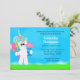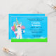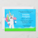 Invitación de cumpleaños para niños con un lindo unicornio sosteniendo helado y una cuchara y usando un gorra fiesta. El fondo es hierba verde y cielo azul. Personalizar con los detalles de su fiesta.