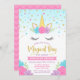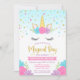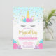 Whimsical unicornio invitaciones para una niñita. Este divertido diseño cuenta con un lindo ilustracion de unicornio, estrellas y flores. Rosa, violeta, verde azulada y un toque de purpurina de oro falso.