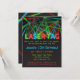 Esta invitación tiene láseres que disparan desde varios puntos. Algunos de los láseres están dirigidos hacia las palabras como si formaran el laser tag de las palabras. Las palabras brillantes Laser Tag no son editables. Paleta de colores de rojo, verde y azul neón sobre fondo negro. Adecuado para niños y adolescentes, especialmente para cumpleaños de chicos. Personaliza fácilmente con los detalles de tu fiesta.