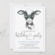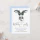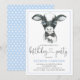 Invitaciones de cumpleaños de vaca con ternero bebé de acuarela linda con corbatín en un fondo de lunares azules. Estas adorables invitaciones de cumpleaños de vaca se personalizan fácilmente para su evento simplemente agregando sus detalles. También puede agregar un color de fondo.