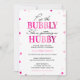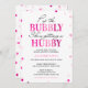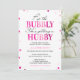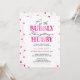 Esta moderna invitación de despedida de soltera presenta un fondo magenta rosa con confeti metálico. El texto está escrito en una mezcla de una fuente de caligrafía juguetona y una fuente serif moderna.