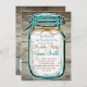 Invitaciones de Despedida de Soltero Rústicas de Campo con un frasco de conserva de bola de acento azul teal en un fondo de madera de granero impreso. Agregue su propia redacción a esta plantilla personalizada.