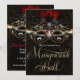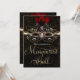 Invitaciones de fiesta de baile de máscara rojas y doradas elegantes. Personalice con texto como desee.