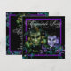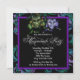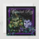 Hermosa invitación para una fiesta de disfraces con máscaras negra y morada que presenta una máscara verde veneciana de Mardi Gras, una máscara morada veneciana de Mardi Gras y elegantes remolinos azules y morados. Esta invitación para una fiesta de disfraces con máscaras negra y morada funciona bien para una invitación para una fiesta de disfraces de Sweet 16, invitación para una fiesta de disfraces de Quinceañera morada, invitación para el cumpleaños de una mujer con máscara, invitación para una fiesta de Mardi Gras, invitaciones para una fiesta de Carnaval, invitación para un baile de disfraces, y cualquier otra fiesta o evento de disfraces con máscaras moradas y se personaliza fácilmente simplemente eligiendo el botón "Personalizar" para comenzar a agregar los detalles del evento, el estilo de fuente, el tamaño y el color de