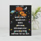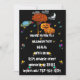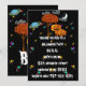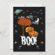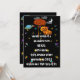 Invitación de Halloween con un cielo negro, luna creciente, Saturno colorido, nubes y más estrellas coloridas abundan. Familia de calabazas lindas paradas junto a un árbol con hojas de color naranja de otoño y un GRAN BOO! Con ojos encima de las letras que te invitan a una fiesta de Halloween de cosecha más no demasiado espeluznante. ¡Perfecto para la fiesta de Halloween de cosecha de la iglesia también!