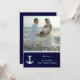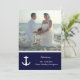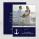 Solo recepción, después de la boda, invitaciones con tema tropical o náutico con plantilla de foto. Papelería clásica azul marino y blanca con texto de plantilla, pareja de ancla blanca y estrella de mar. Presentando a los recién casados. Mejora el papel si lo eliges.