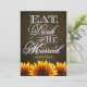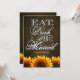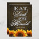 Coma la bebida y sea invitaciones casadas de la boda del girasol de la pizarra de Brown---haga juego las tarjetas de RSVP y más encontraron abajo en esta página. Felicite su tema del boda del girasol con estas invitaciones con las cuales ofrezca una textura marrón de la pizarra como fondo coman, bebida y esté casado en escritura elegante con los girasoles vibrantes en la parte inferior del frente y de la parte posterior de cada invitación.
