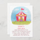 Una invitación con una copia explorada de un ilustracion de la acuarela de una tienda roja y blanca del carnaval sobre los cielos azules y la hierba verde del césped. Perfeccione para los niños que tienen una fiesta de cumpleaños temática del carnaval del patio trasero. Esto es también perfecto para las escuelas que están llevando a cabo un carnaval de la escuela. Personalice fácilmente con sus detalles del fiesta.