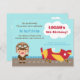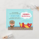 ¡Encima de, encima de y lejos! ¡Invite a sus huéspedes encima para un fiesta para el muchacho del cumpleaños con esta invitación temática colorida y de la diversión del aeroplano! Características del diseño un muchacho lindo en el equipo del aviador de gafas grandes y el gorra que agita su mano como él se está preparando para volar un avión poco rojo y amarillo entre las nubes. Personalice fácilmente con sus detalles del fiesta.