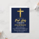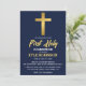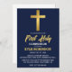 Celebre el día especial de su hijo con estas elegantes y sofisticadas invitaciones a la primera comunión. Con un bonito fondo acuático azul marino, un delicado diseño de cruces y un toque de Relieve metalizado dorado, estas invitaciones son perfectas para una celebración moderna y elegante. El diseño es el personalizable para coincidir con el tema y la paleta de colores de tu evento.