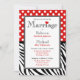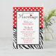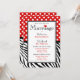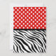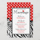 Elegantes invitaciones de boda con puntos de polka blanco sobre rojo en la parte superior y rayas de cebra en blanco y negro en el fondo. Personaliza con los detalles de la ceremonia y recepción y elige tu tipo de papel también!