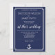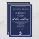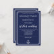 Invitaciones nupciales náuticas con marco blanco, ancla blanca y texto blanco personalizado, cuando la pareja se hospeda con sus familias, impresas en fondo azul marino