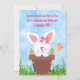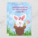 Conejo conejo conejito blanco y rosado en maceta de flores con invitación de fiesta de cumpleaños de mariposa adorable.