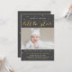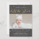 Twinkle twinkle pequeñas estrellas invitaciones para una fiesta de primer cumpleaños para un niño o chica, con una foto personalizado de estrellas de bebe y blanco y oro contra un fondo de color gris de pizarra. "¡Twinkle, pequeña y brillante estrella, de un año es lo que eres!" está en oro y blanco, con detalles de la primera fiesta de cumpleaños debajo. También puedes las cartas como invitaciones de primer cumpleaños.
