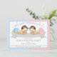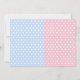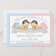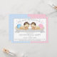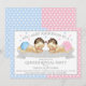 Invitaciones de revelación de género para baby shower con adorable bebé niño y niña sobre un fondo de puntos rosas y azules. Estas lindas invitaciones de revelación de género de bebé en rosa y azul se personalizan fácilmente para su evento simplemente agregando sus detalles.