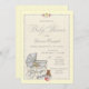 Chic chic Shabby invitaciones a la ducha de bebé con un hermoso carro de bebés, oso de peluche y regalos en un fondo vintage floral y de rayas amarillas. Esta invitación a la ducha de bebé vintage para chicas dulces se personaliza fácilmente para tu evento simplemente añadiendo tus detalles en el estilo de letra y la redacción de tu elección.