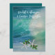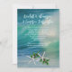 Plantilla de invitación a la boda en crucero con fondo oceánico y pez estrella con diseño holly. Invitar a los invitados a un matrimonio en diciembre en alta mar usando esta plantilla con texto azul pálido en forma de párrafo. Cambiar la redacción y añadir espacios para un boda de Navidades sin litoral. Los nombres de la pareja están en la parte superior de un gran guión escrito a mano. Dos estrellas de mar blancas están envueltas en un hueco verde en el fondo. Compra también como descarga instantánea para compartirla en línea.
