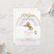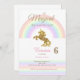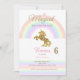 Estas invitaciones de unicornio tienen un arco iris y unicornio dorado. Dicen "¡Un día mágico está en camino!"