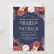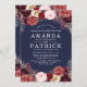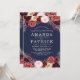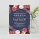 Invitaciones del Partido de Compromiso de la Marina de Marsala - presenta un fondo azul marino con varias peonías, rosas y otros elementos florales en tonos de Marsala, burdeos, rosa azul, gris y más. Vea la colección coincidente de esta página para completar la búsqueda del evento.