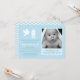 Una invitación azul en colores pastel moderna, elegante y minimalista del bautizo o del bautismo en honor del bebé. Elementos dominantes del bautismo de las características del diseño como la paloma, la vela con una cruz y un espacio para la personalización de la foto del poco una. En revés la página es un modelo de zigzag azul y blanco en colores pastel del galón. Personalice fácilmente con los detalles del acontecimiento.