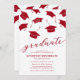 Invitaciones minimalistas a los partidos de graduación con gorros de mortero rojos caídos, y una plantilla de texto moderna que es fácil de personalizar.
