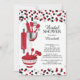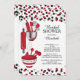 La acción moderna la invitación nupcial de la ducha de la cocina que ofrece un rodillo, bol grande, espátula, cortador de la pizza, bate, el policía vegetal y las cucharas dosificadoras fijados en un fondo blanco contemporáneo con confeti rojo y negro del lunar. Visite nuestra tienda para ver esta invitación en una variedad de invitaciones populares de la ducha del boda.