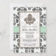 Las invitaciones nupciales de la ducha de la flor de lis bonita del oro con un corazón y un contraste cosen el jade ligero de la verde menta y diseño negro de la cinta y frontera blanco y negro levemente apenada del damasco. Ilustraciones y © Chrissy H. Studios, LLC del diseño. Todos los derechos reservados.