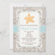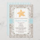 La playa bonita y las invitaciones nupciales temáticas náuticas de la ducha con una estrella de mar amarilla, remolino delicado enmarcaron la frontera e imprimieron diseño azul de la mirada de la puntada del contraste de la aguamarina en un fondo rayado sutil con un modelo del damasco y del corazón. La parte posterior de esta invitación de la ducha del boda tiene una impresión azul y del blanco de las rayas de la sirsaca. © Chrissy H. Studios, LLC de las ilustraciones. Todos los derechos reservados.