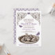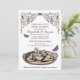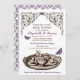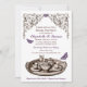 Las invitaciones nupciales de la fiesta del té del jardín púrpura ofrecen un juego de té y mariposas con un jefe floral de la voluta y modelos adornados en púrpura, marrón, y blanco.