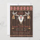Invitaciones para baby shower de niños con cráneo rústico y plumas y flechas en un fondo de madera rústica y diseño nativo americano. En la parte posterior, puede elegir su fondo simplemente moviendo el fondo de madera rústica una capa hacia arriba para cubrir el diseño nativo americano. Puede personalizar fácilmente esta invitación para baby shower tribal del suroeste para su evento simplemente agregando sus detalles.
