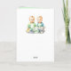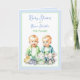 Dulces invitaciones de baby shower azules y verdes para gemelos niños. Gemelos niños en acuarela sosteniendo juguetes como un cordero, conejo y pollito