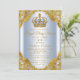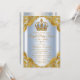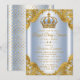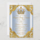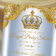Invitaciones para baby shower de príncipe azul con hermoso bebé azul y corona dorada en un elegante fondo de remolino azul bebé y dorado en la parte frontal y hermosos puntos dorados en el mismo fondo azul bebé en la parte posterior. Estas invitaciones para baby shower del príncipe azul bebé y dorado se personalizan fácilmente para su evento simplemente agregando sus detalles en el estilo de fuente y redacción de su elección. Puede mover la corona y el divisor dorado según sea necesario.