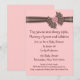 Invitación para baby shower rosa y marrón. Lazo de volantes marrón oscuro con diseño de botón rosa sobre fondo rosa.