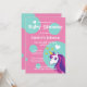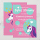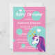 Invitaciones a una ducha de bebé de unicornio para un chica de recién nacido. El fiesta personalizado invita con corazoncitos y caballo mágico. Diseño de plantillas de ducha de niños con colores pastel rosa y azul turquesa. Hermosa tipografía elegante con pequeños íconos de amor. Texto personalizable con RSVP y línea de registro. Tarjetas adorables para tu pequeña princesa hija o nieta. Diseño de papel elegante para embarazadas o madres.