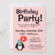 invitaciones para cumpleaños 5 con pingüino de dibujos animados divertido. Invitaciones personalizadas para cumpleaños de niños y otras ocasiones divertidas. Texto de anuncio personalizable, número de edad y color de fondo. Fondo rosa femenino con patrón de lunares blancos. Plantilla de quinto cumpleaños para niños. Específico para la edad, para niñas de cinco años.