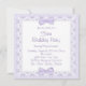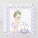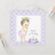 Invitación de cumpleaños para la primera fiesta de cumpleaños de la princesa lavanda con una adorable princesa vintage que lleva pantalones de volantes de lavanda y una corona dorada sobre un hermoso fondo de pastel de cumpleaños de encaje de lavanda. Esta linda invitación de cumpleaños de lavanda púrpura se personaliza fácilmente para su evento agregando los detalles del evento, el estilo de fuente, el tamaño y el color de la fuente y la redacción.