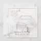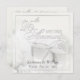 Elegantes invitaciones para la fiesta del 25 aniversario de boda -- Rosas de boda y copas de champán en fondo blanco con letras en escritura plateada. Personalice los nombres, fechas y detalles para esta ocasión especial y honrada. Tarjetas de agradecimiento y franqueo a juego disponibles en la galería.
