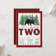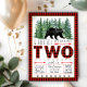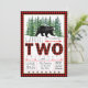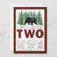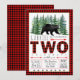 Invitaciones para la fiesta de cumpleaños número dos de niños leñadores con un oso rústico y abetos sobre un fondo de cuadros de búfalo de leñador. Esta linda invitación de cumpleaños número 2 de leñador con un oso de cuadros de búfalo rojos y negros se personaliza fácilmente para su evento simplemente agregando los detalles de su evento.