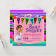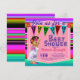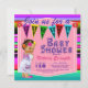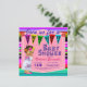 Invitación de fiesta de bebé con una adorable bebé vistiendo un vestido colorido de Puebla sobre un fondo de serape multicolor. Estas adorables invitaciones de fiesta de bebé para niña se personalizan fácilmente para su evento simplemente agregando sus datos.