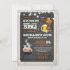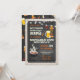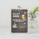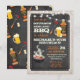 Invitaciones para fiesta de Bourbon, cerveza y barbacoa con luces de cuerda en lino falso antiguo y fondo de pizarra. Características dibujadas a mano de bourbon, vaso de chupito, cerveza, parrilla de barbacoa y utensilio. Este es para un cumpleaños, pero puede cambiar toda la redacción para adaptarlo a sus necesidades, como una jubilación, cena de ensayo, barbacoa en el patio trasero.
