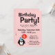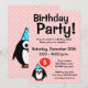 Invitaciones para fiesta de cumpleaños número 5 con dibujo de pingüino divertido. Invitaciones personalizadas para cumpleaños de niños y otras ocasiones divertidas. Texto de anuncio personalizable, número de edad y color de fondo. Fondo rosa femenino con patrón de lunares blancos. Plantilla de cumpleaños número cinco para niños. Específico para la edad, para niñas de cinco años.