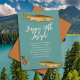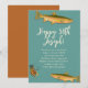 Invitaciones de cumpleaños para hombre adulto para un pescador. Diseño de trucha moteada y señuelo de pesca con mosca en papel azul grisáceo con texto beige. Personalice fácilmente con su nombre, en letra negrita, en la parte superior. Toda la información de la fiesta se agrega en forma de párrafo. Elija opciones de impresión y/o descarga. El reverso es de color naranja oxidado sólido.