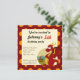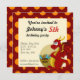 La impresión de cumpleaños invita con el ilustracion de un dragón rojo que custodia un tesoro. Ilustrado por Maxi Harmony