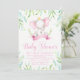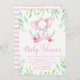Chicas elefantes invitaciones a la ducha de bebé con adorables acuarelas elefantes con una corona de princesa sobre una hoja de palma de bonito y fondo de rayas de color rosa. Estas invitaciones a la ducha de bebé de elefantes chicas se personalizan fácilmente para su evento simplemente añadiendo los detalles del evento en el estilo de letra y la redacción que prefiera.