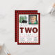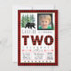 Invitación de cumpleaños número dos de leñador para niños con oso y árboles en un fondo a cuadros de búfalo rústico de leñador. Esta linda invitación de cumpleaños número dos de leñador con cuadros de búfalo rojos y negros se personaliza fácilmente para su evento simplemente agregando su foto y detalles del evento.
