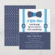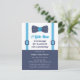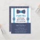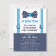 ¡Un pequeño hombre está en camino! Celebremos con un día especial. Esta invitación de baby shower moderna y minimalista cuenta con una pajarita de lunares azules con tirantes de rayas inclinadas. Diferentes tonos de azul, una paleta de colores adecuada para un bebé varón. Personaliza fácilmente con los detalles de tu baby shower.