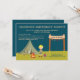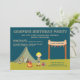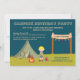 Esta fiesta de cumpleaños para niños 5x7 tiene un tema de camping lindo. Cuenta con un muchacho rubio parado al lado de una fogata con su saco de dormir a sus pies. Al fondo, hay una tienda verde con una linterna, un perro caliente en un palo y un malvavisco en un palo en la parte delantera. A la derecha hay un cartel con el nombre del niño de cumpleaños que puedes personalizar fácilmente. En la parte superior e izquierda, puedes personalizar toda la información de la fiesta de cumpleaños. © 2012 Ilustraciones Jessica Weible/JW