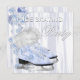 Invitación a una fiesta de patinaje sobre hielo con patines de bonito y mitones sobre un fondo de copos de nieve azul y blanco. Esta tierna invitación para la fiesta de cumpleaños de patinaje sobre hielo se personaliza fácilmente para tu evento, simplemente añadiendo tus detalles en el estilo de letra y la redacción que prefieras.